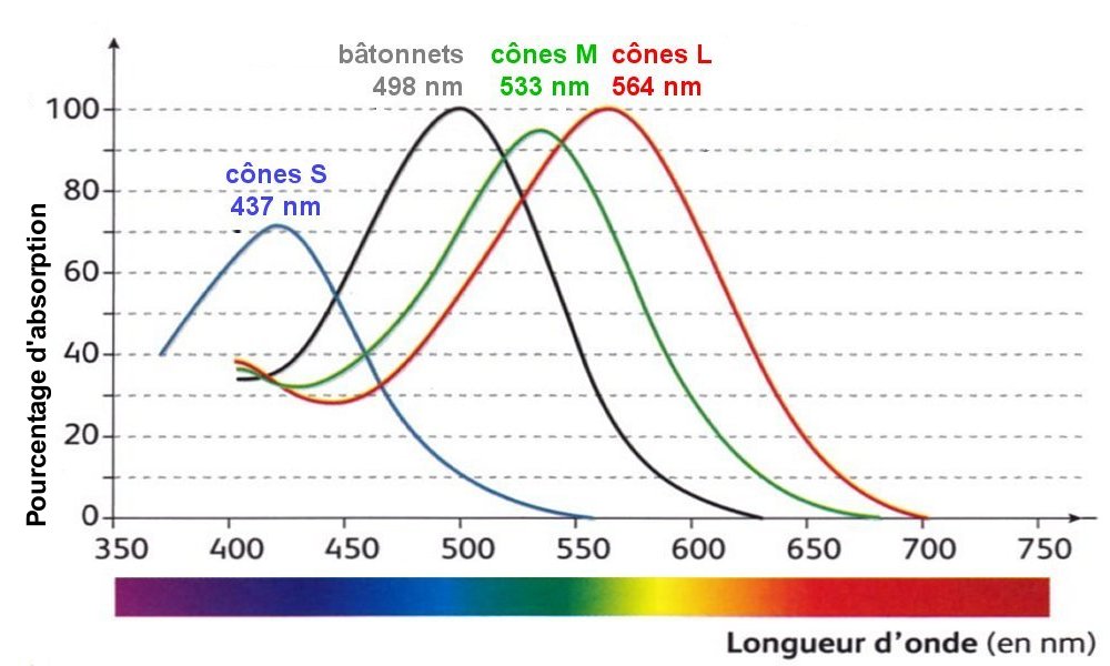 Certains cônes sont sensibles aux teintes bleues, d’autres aux teintes vertes tandis qu’une troisième catégorie permet de distinguer les teintes rouges. Bien que rare, certaines personnes (principalement des femmes) possèdent un quatrième type de cône, leur permettant de percevoir plus de variétés dans les teintes rouges.